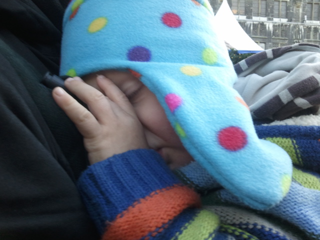 Ach - und der Verschluss fehlt noch - konnte ich wegen schreiendem Kind nicht rechtzeitig bis zur Abfahrt anpassen... Deshalb hängen die Ohrenschützer so wild umher (besonders beim Kopfüber-Bild)