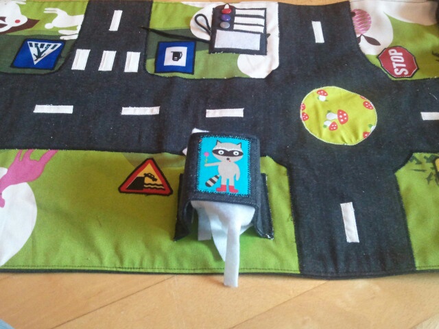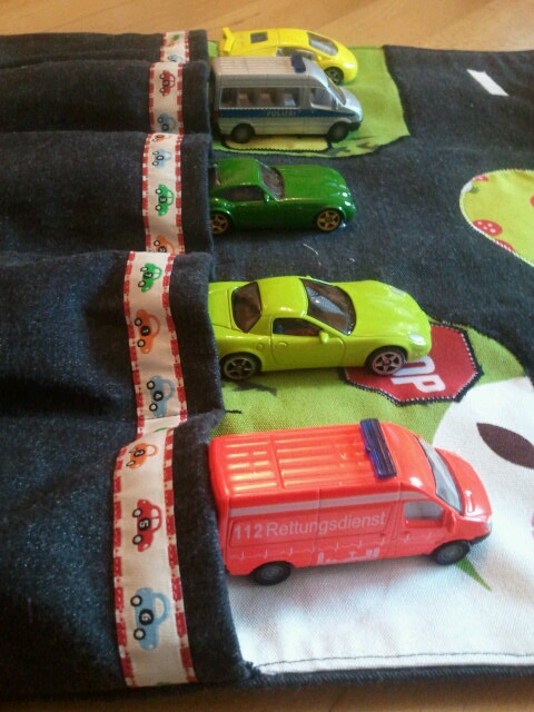 Der Kurze hat heute Geburtstag und da wir dieses Jahr einige Feiern außerhalb haben, bei denen wir nicht ganz genau wissen, ob dort noch andere Kinder dabei sein werden, ist so eine Spielmatte für die Streichholzschachtel-Autos genau das richtige.