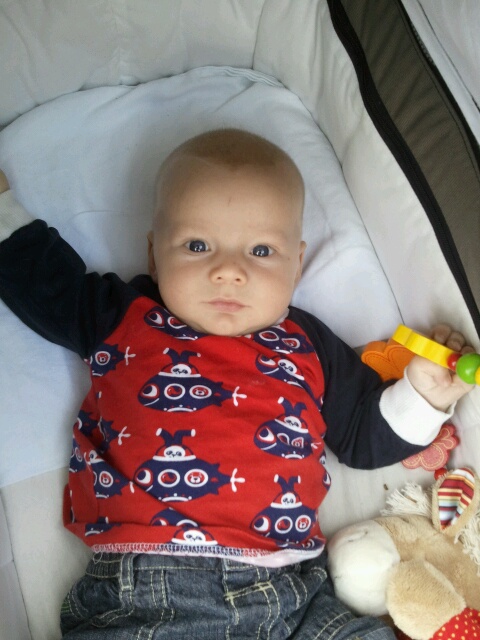Allerdings muss ich heute etwas zeigen, dass nicht ich genäht habe. Das süße Shirt war in den letzten (kalten) Sommertagen häufig in Gebrauch. Aber ich hoffe, dass Franzi mir nicht böse ist, wenn ich sage, dass ich Noah am liebsten jetzt kurzärmlige Shirts anziehen würde... Der Sommer muss endlich mal kommen!!
