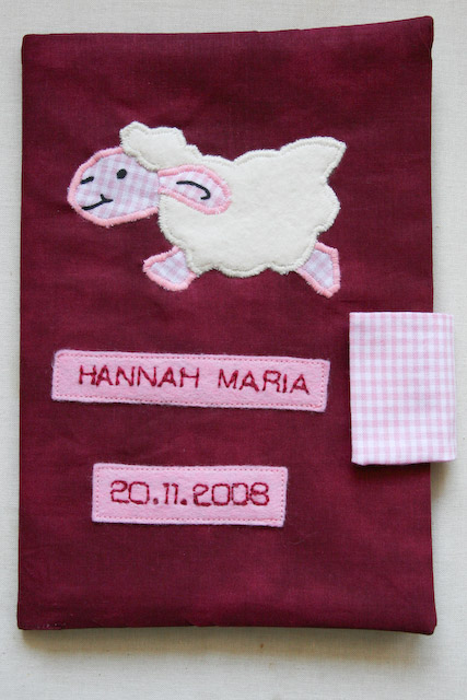 Bereits zum zweiten Mal habe ich eine Untersuchungsheft-Hülle mit einem Schäfchen angefertigt. Das besondere an diesem U-Heft-Umschlag ist, dass auf der Rückseite noch die Geburtstdaten des Mädchens mit Uhrzeit, Größe, Gewicht und Kopfumfang aufgestickt sind.