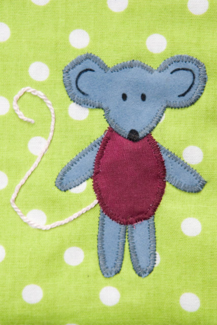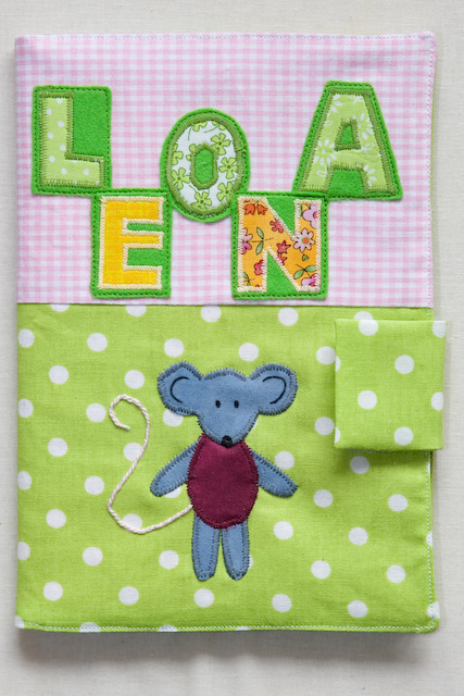 Dieser Umschlag für ein Untersuchungsheft wurde für ein kleines Mäuschen angefertigt. Zur Abwechslung wurde das Tier diesmal im unteren Bereich des Heftes aufgenäht. Der Name ist komplett appliziert.