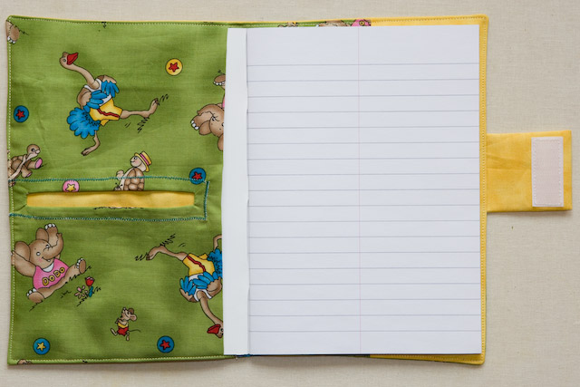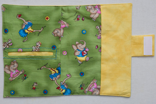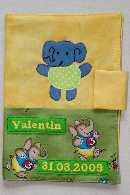 Elefanten sind das Motiv dieses U-Heft-Umschlages. Für den Jungen habe ich eine nicht-kursive Schriftart gewählt. Der Stoff des unteren Abschnitts passt sehr gut zum kleinen Rüsselträger.