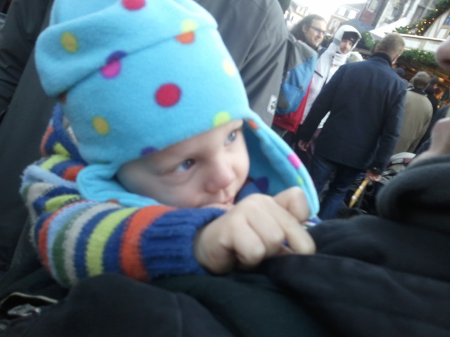 Aber nun will ich Euch Fotos nicht vorenthalten. Da der Kleine bei der ersten Anprobe "not amused" war, musste ich Fotos während des Weihnachtsmarkt-Besuches machen - also nur mäßige Qualität...