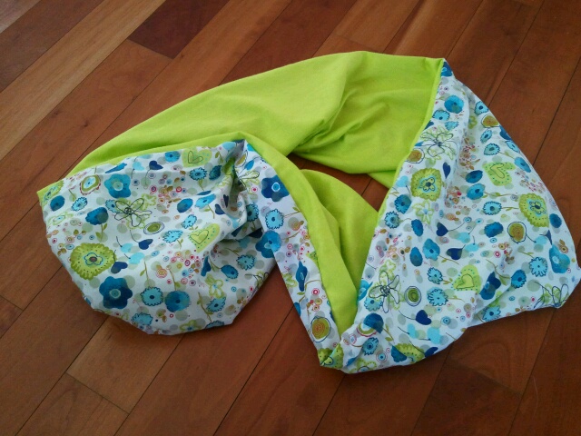 Da dort alle mit einem tollen Loopschal rumliefen, MUSSTE ich mir auch mal wieder einen nähen, einen, den man auch mal als Accessoire IN der Wohnung tragen könnte. Also hatte ich einen ganz leichten Frühlingsstoff gekauft mit blau-grünen Blümchen drauf. Mir war einfach danach. Wie ich den Loop vervollständigen könnte? Keine Ahnung.