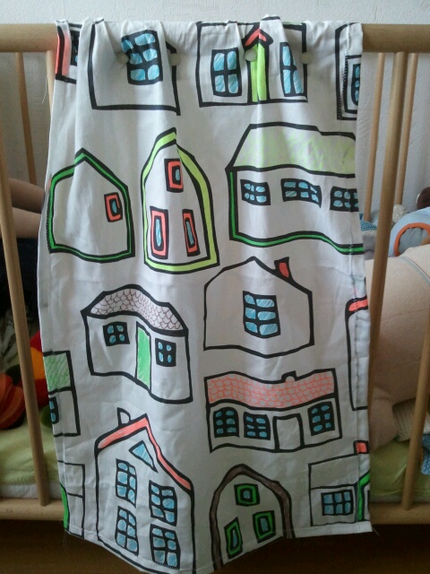 Mir war nämlich eingefallen, dass ich von meinem letzten Besuch beim Möbel-Schweden einen passenden Stoff mitgenommen hatte - mit kleinen Häusern drauf. Wofür ich den gedacht hatte wusste ich nicht mehr, dass ich die Häuser aber anmalen wollte, das war mir noch im Gedächtnis geblieben.