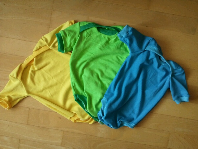 Jedenfalls habe ich für die 3 Bodies ohne Zuschnitt etwa 3,5 Stunden gebraucht. Davon war der erste etwas fummelig, aber wenn man schonmal ein Shirt mit amerikanischem Ausschnitt genäht hat ist es wirklich kein Problem.
