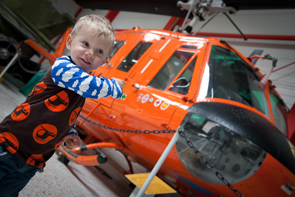 Aber das Allerbeste kam dann knapp vor Ende der Ausstellung. Ein Hubschrauber genau wie auf seinem T-Shirt. In seiner Lieblingsfarbe. Orange!