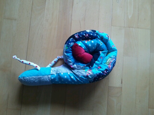 Die Schlaecki besteht quasi aus einem langen Schlauch wie eine Schlange, jedoch kann man sie rollen und mit einem Druckknopf zu einer Schnecke umformen. Der Kopf besteht aus Frottee - unten aus grauem, den ich noch im Bestand hatte - und oben aus blauem bzw. grünem Handtuch vom Möbelschweden. Die Fühler sind oben geknotet, vielleicht als Greif-anregung für den Kleinen? Die Schwanzspitze ist Nicki-Stoff, der Rest sind verschiedene Baumwollstoffe. Für das eine Kind in grün/gelb, für das andere in blau/türkis.