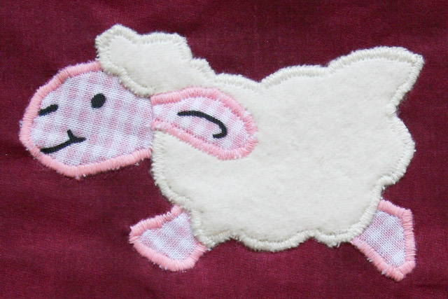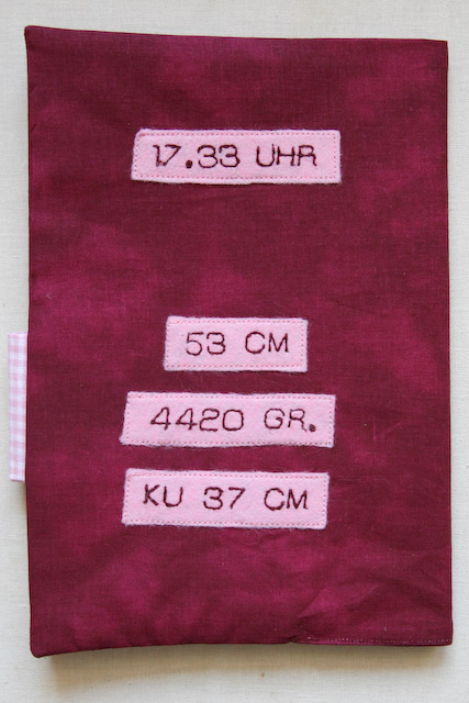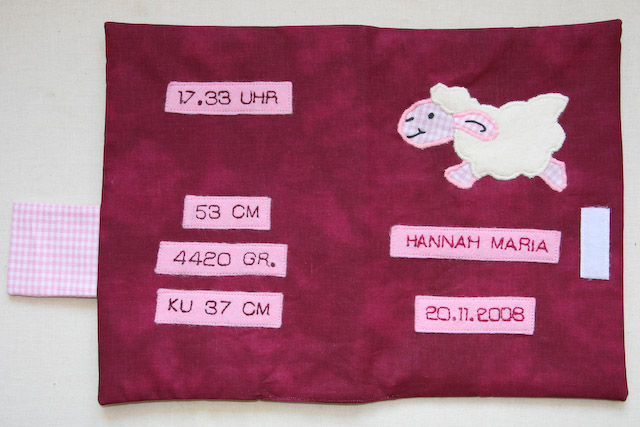 Bereits zum zweiten Mal habe ich eine Untersuchungsheft-Hülle mit einem Schäfchen angefertigt. Das besondere an diesem U-Heft-Umschlag ist, dass auf der Rückseite noch die Geburtstdaten des Mädchens mit Uhrzeit, Größe, Gewicht und Kopfumfang aufgestickt sind.