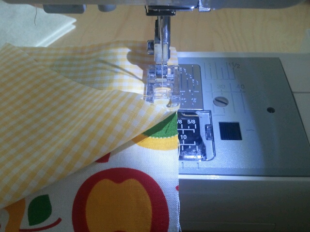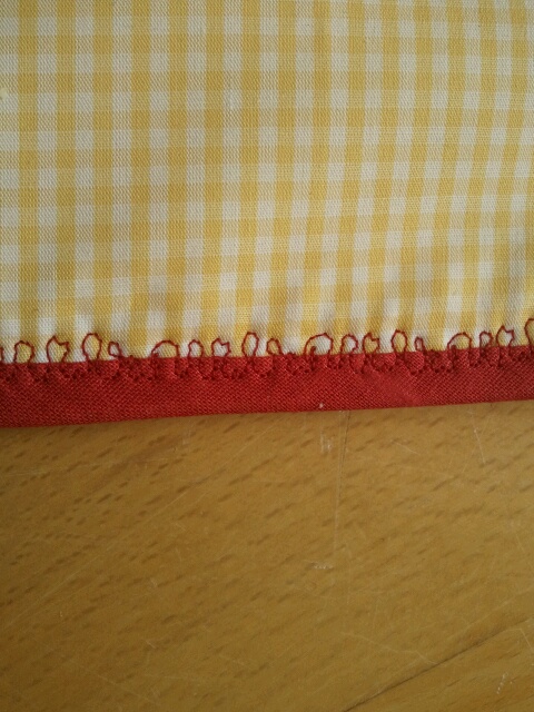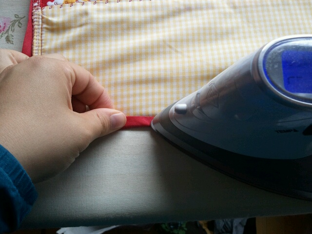 Die Naht mit einem Zierstich (oder wenn nicht vorhanden z.b. einem Zickzack oder einer geraden Naht einige Millimeter rechts und links von der Naht) verschönern. Dabei liegt der Patchworkstoff AUF dem Bodenwischtuch - beides wird also miteinander verbunden.
