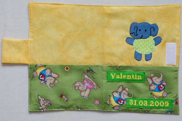 | | Elefanten sind das Motiv dieses U-Heft-Umschlages. Für den Jungen habe ich eine nicht-kursive Schriftart gewählt. Der Stoff des unteren Abschnitts passt sehr gut zum kleinen Rüsselträger.