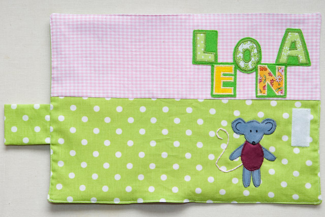 | | Dieser Umschlag für ein Untersuchungsheft wurde für ein kleines Mäuschen angefertigt. Zur Abwechslung wurde das Tier diesmal im unteren Bereich des Heftes aufgenäht. Der Name ist komplett appliziert.