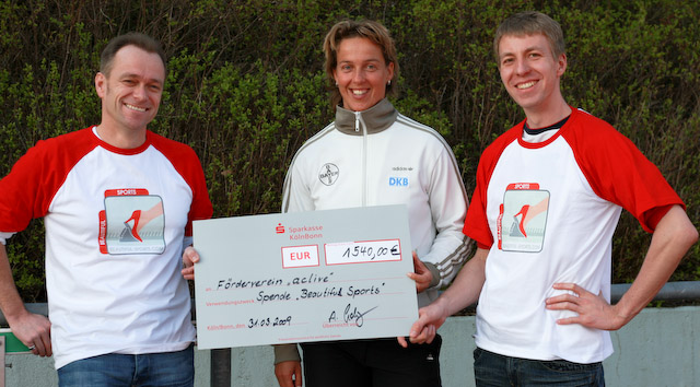| | Über eine Spende in Höhe von 1540 Euro konnte sich Steffi Nerius, Schrimherrin des Leverkusener Behindertensport-Fördervereins „aclive“, freuen. Überreicht bekam die Speerwurf-Europameisterin den Scheck durch die beiden Initiatoren des Projektes „Beautiful Sports“, Axel Kohring und Markus Paniczek. Das Geld soll den Kindern der Behindertensportabteilung des TSV Bayer 04 zugute kommen und für Trainingsfreizeiten und die Anschaffung neuer Materialien verwendet werden. Gesammelt wurde die Summe durch den Verkauf des „Beautiful Sports“-Fotokalenders 2009, den Kohring und Paniczek im vergangenen Jahr in Zusammenarbeit mit zwölf Bayer-Leichtathletinnen, unter anderem der Deutschen Hallenrekordlerin im Stabhochsprung, Silke Spiegelburg, und der Siebenkampf-EM-Vierten Jennifer Oeser, produzierten.