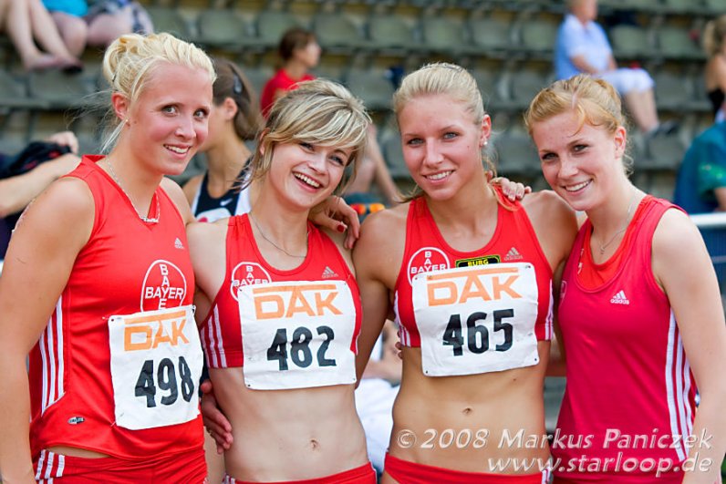 | | Innerhalb weniger Minuten haben Annett Horna und Robin Schembera bei den Deutschen Juniorenmeisterschaften in Recklinghausen über 800 Meter für einen goldenen Doppelschlag gesorgt. Nachdem Horna in 2:10,00 Minuten zum Sieg spurtete, lief der U20-Europameister das Rennen in 1:53,22 Minute kontrolliert nach Hause. Den dritten Leverkusener Triumph sicherte Stabhochspringer Malte Mohr mit 5,55 Metern. Hinzu kamen vier silberne und drei bronzene Plaketten für den TSV Bayer 04.